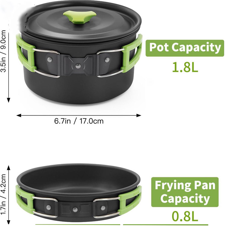 Sesuai untuk pelbagai sumber haba termasuk dapur kem, kebakaran terbuka, dan gril mudah alih. Pot dan kuali mengendalikan segala -galanya dari air mendidih untuk menggoreng makanan dengan mudah.