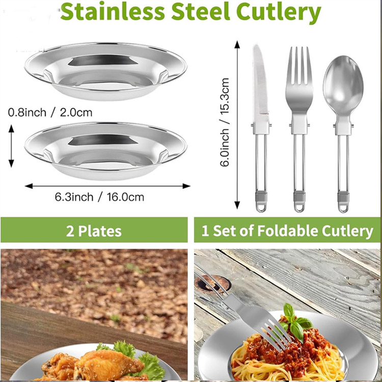Kit komprehensif ini termasuk semua yang diperlukan untuk makanan luaran: periuk, kuali, cawan, pinggan, garpu, pisau, dan sudu - menyediakan penyelesaian dapur lengkap untuk pengembaraan perkhemahan.