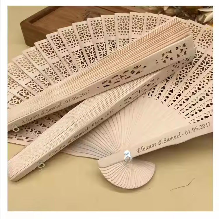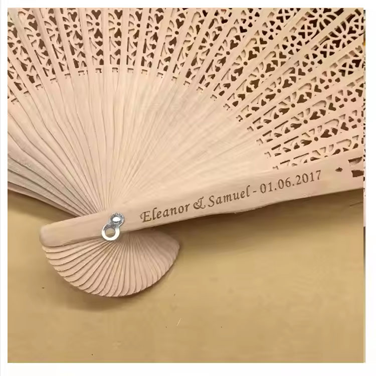 Peribadikan kipas dengan nama, tarikh acara, logo, atau mesej yang bermakna melalui percetakan berkualiti tinggi atau ukiran laser. Memento yang bijak dan berkekalan untuk tetamu atau pelanggan, yang direka untuk memadankan tema atau identiti jenama acara anda.