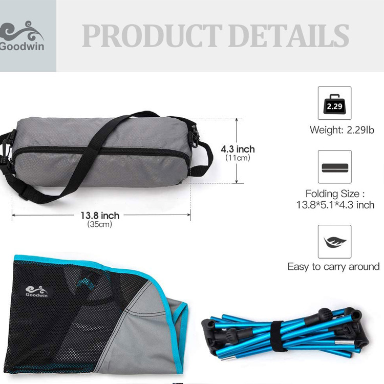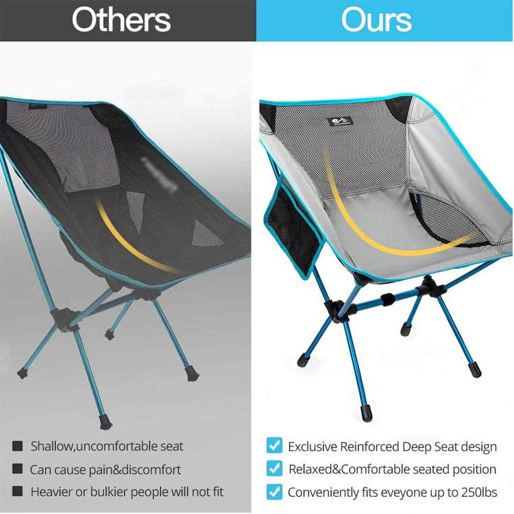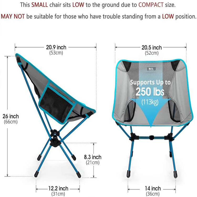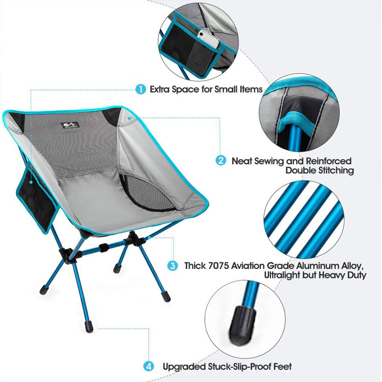 Ultra-Lightweight Portable Compact Camping Camping Chair.MenJoy Comfort di mana sahaja dengan kerusi lipat mudah alih ultra-ringan ini. Kompak dan mudah dibawa dengan beg penyimpanan yang berguna, ia sesuai untuk perjalanan pantai, perkhemahan, backpacking, hiking, atau pengembaraan luar di mana keselesaan memenuhi kemudahan.