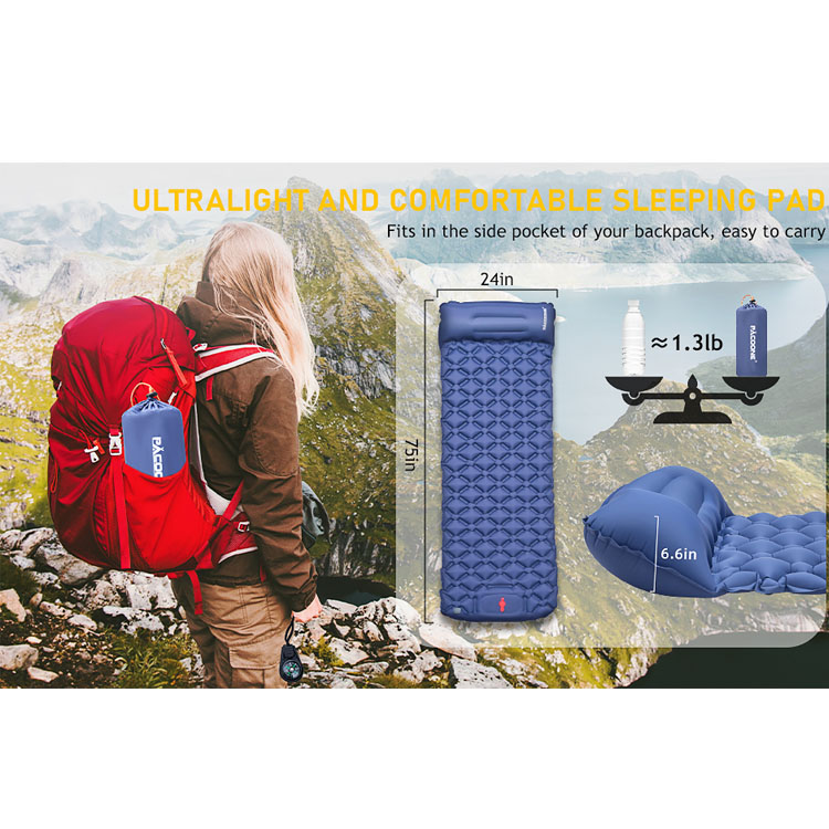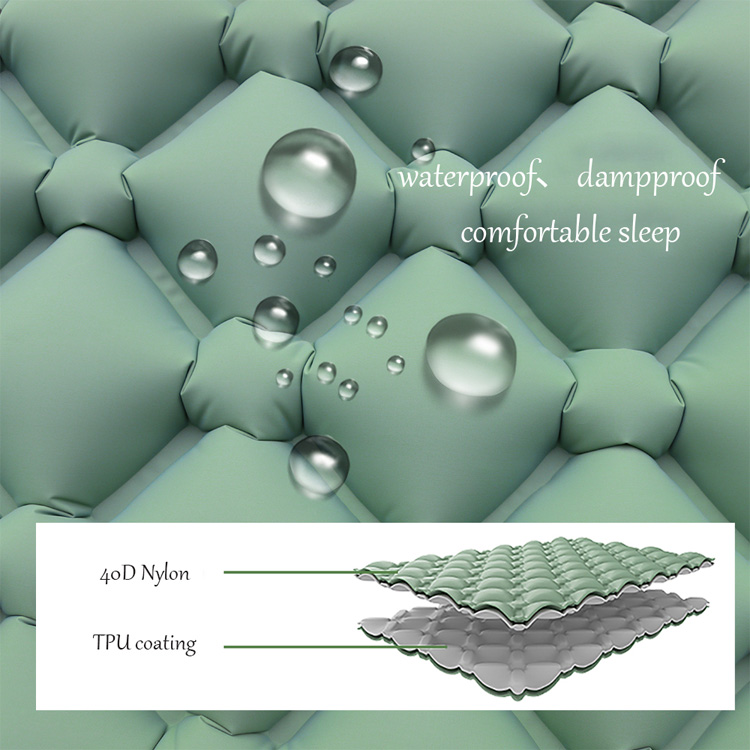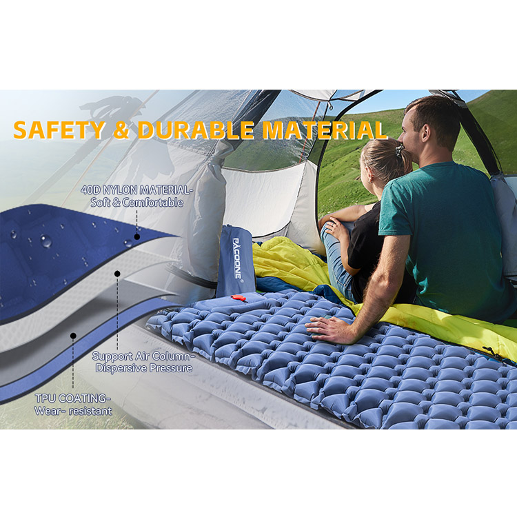Bahan nilon ringan lipat perkhemahan khemah tidur pad tidur. Anda penyelesaian tidur mudah alih yang muktamad untuk pengembaraan luar. Tilam kembung ultralight ini mempunyai inflasi tunggal dan reka bentuk bantal bersepadu. Dibuat dari bahan nilon tahan lama, ia memberikan keselesaan yang lebih baik untuk mendaki dan berkhemah, memastikan malam yang tenang di mana -mana sahaja.