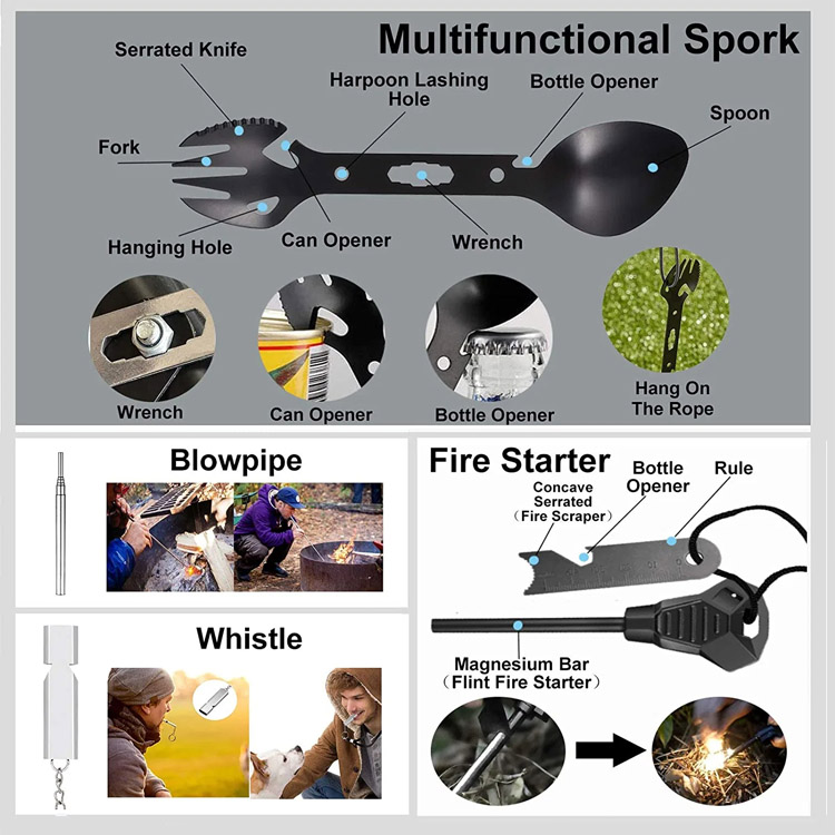 Termasuk batang starter magnesium api dengan penyerang ketepatan yang menghasilkan pancuran bunga api panas, yang mampu menyalakan Tinder walaupun dalam keadaan lembap, memastikan anda dapat mencipta api yang mengekalkan kehidupan.